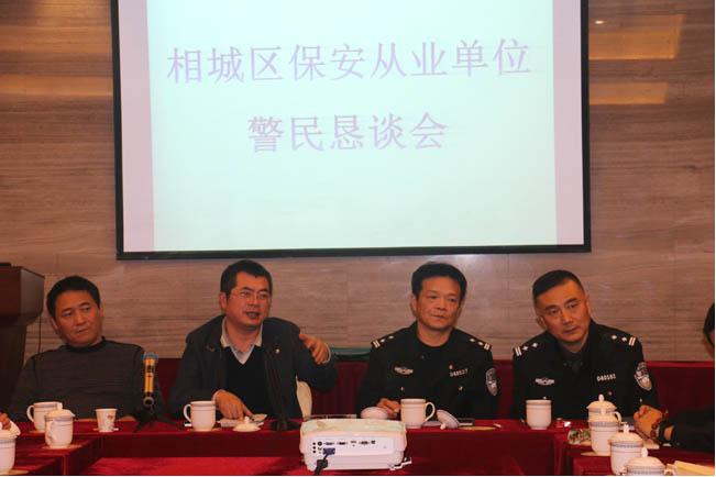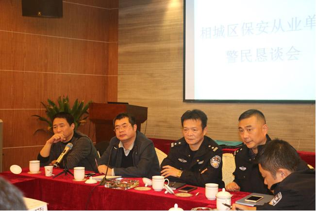 2015年11月19日14:30在江蘇康平保安公司會(huì)議室舉行:相城區(qū)保安從業(yè)單位警民懇談會(huì),與會(huì)的有市公安局治安支隊(duì)保安監(jiān)管大隊(duì)的朱大、戴大,公安相城分局治安大隊(duì)的楊大、賀大、吳警官,還有相城區(qū)各保安行業(yè)的企業(yè),通過(guò)懇談會(huì),深刻領(lǐng)悟市局、分局領(lǐng)導(dǎo)有關(guān)指示精神!今年10月—12月省公安廳開(kāi)展保安市場(chǎng)專項(xiàng)整治活動(dòng),公司積極做好:治安信息員、法制宣傳員、義務(wù)巡邏隊(duì)員工作,爭(zhēng)取完成省公安廳要求2016年6月底前所有在崗保安員必須持證上崗的指示,向兄弟單位學(xué)習(xí),不斷完善服務(wù)質(zhì)量,提高公司核心競(jìng)爭(zhēng)力,走品牌化道路的戰(zhàn)略目標(biāo)前行!